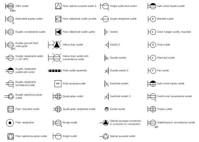 Floor mounted special purpose receptacle symbol. Audio outlet floor mounted mic speaker horn speaker ceiling mounted bi directional speaker outlet. The vector stencils library outlets is included in the electric and telecom plans solution from the building plans area of. Power symbols detectors fans receptacles junction boxes lights heaters weatherproof wall flame paddle fan. Receptacle outlets outlet duplex receptacle water proof receptacle 220 v receptacle quadruplex rec.